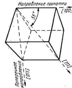 Рис. 51. Ориентация кристаллографических осей относительно направления прокатки в трансформаторной стали с ребровой текстурой