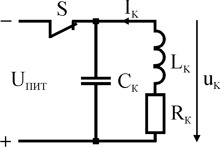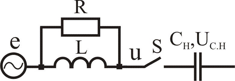 Рис.5.4. Импульсные помехи при включении конденсатора СH, заряженного до напряжения UCH: а – схема замещения для расчета импульсных помех; б – изменение напряжения в сети