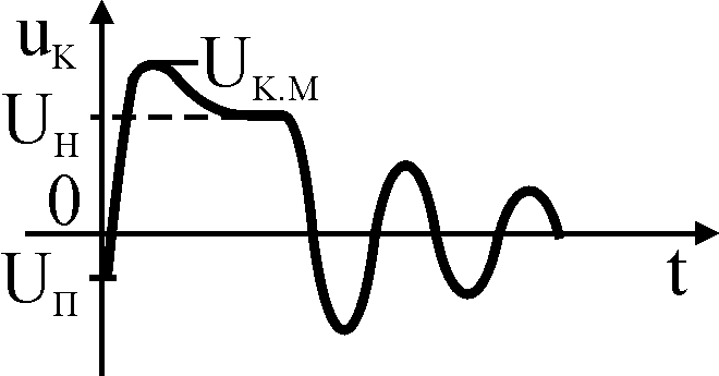 Импульсные помехи, возникающие в электрической сети при включении конденсатора СH, рассмотрены в п.2.3.3. Амплитуда импульсной помехи (максимальное отклонение напряжения от величины е) определяется разностью мгновенного значения напряжения в сети е и напряжения заряда конденсатора в момент коммутации (рис.5.4):