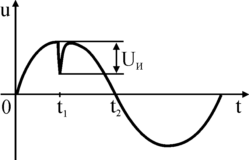 Импульсные помехи, возникающие в электрической сети при включении нагрузки с сопротивлением RH, описаны в п.2.3.2. Амплитуда импульсной помехи (максимальное отклонение напряжения от величины е) прямо пропорциональна мгновенному значению напряжения в сети е в момент коммутации (рис.5.2) и определяется следующей формулой: