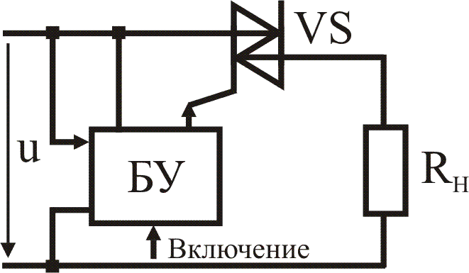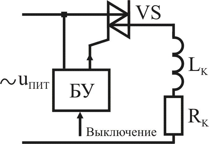 Полное устранение перенапряжения и помех при отключении катушки индуктивности возможно только при равенстве нулю тока IK = 0 в момент отключения (5.1). В цепи переменного тока это условие может быть реализовано с помощью схемы на рис.5.7, а. Блок управления БУ включает симмистор каждый полупериод питающего напряжения, подавая напряжение на управляющий электрод относительно условного катода. Снятие управляющего напряжения приведет к выключению симмистора при ближайшем переходе тока через ноль. Для цепей постоянного тока такой момент отсутствует и использование этой схемы невозможно.
