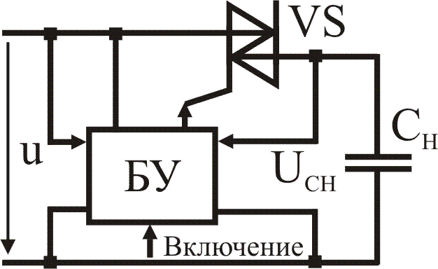 Блок управления БУ обеспечивает требуемое изменение сопротивления транзистора VT во времени, ограничивая скорость изменения тока в катушке индуктивности.