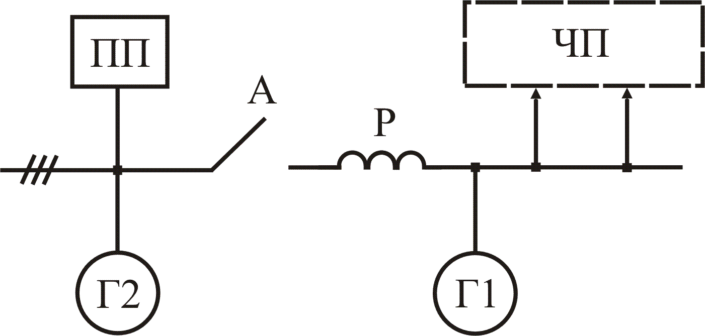 В дополнение к рассмотренным структурам питания ЧП при периодических помехах необходимо учитывать, что источников значительных периодических помех в СЭЭС, как правило, немного, это один или несколько ПП большой удельной мощности. Поэтому возможен вариант подключения ПП к отдельной секции шин ГРЩ (рис.5.21), питаемой автономным генератором Г2, а ЧП – к другой секции, питающейся от генератора Г1.