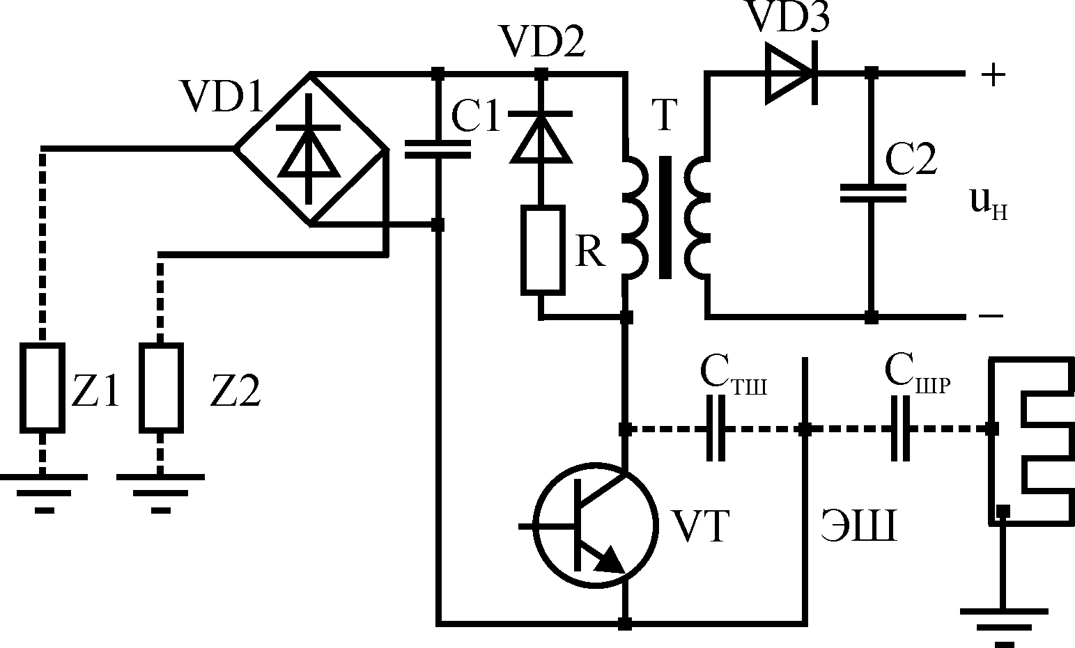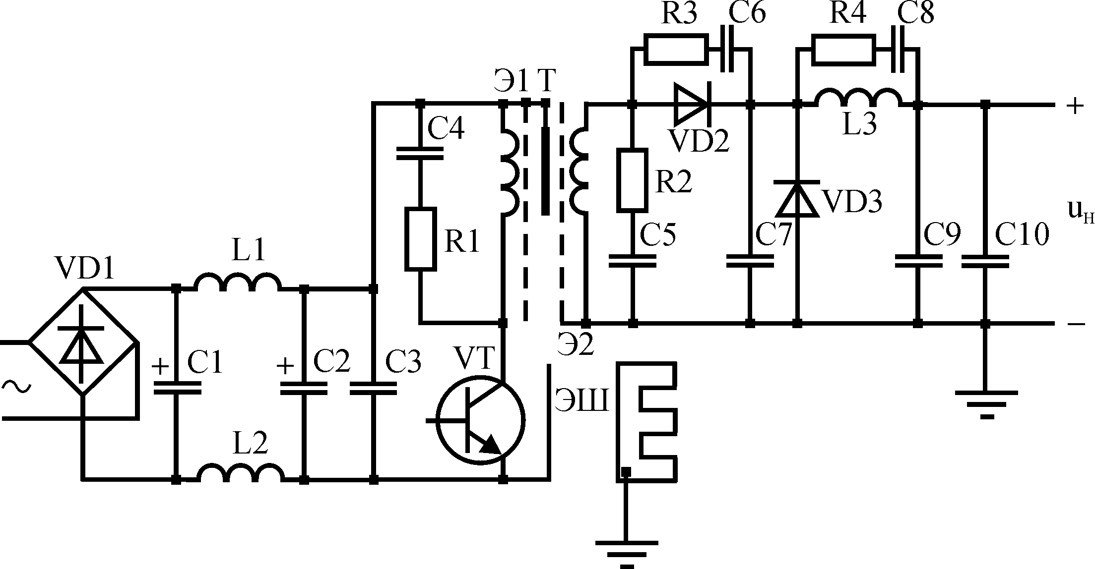 Установка межобмоточных экранов в трансформатор преобразователя значительно снижает передачу помех через трансформатор от одной части схемы к другой. Экран может представлять один незамкнутый слой фольги. Возможно применение двух экранов, каждый из которых может соединяться с разными цепями (трансформатор Т на рис.5.18). Установка экранов уменьшает емкость между обмотками, что приводит к уменьшению передаваемых помех. Экран Э1 локализует помехи, создаваемые транзистором VT, а экран Э2 –помехи от диода VD2. Расположение и соединение элементов также влияет на уровень создаваемых помех. Следует перевивать пары проводников, по которым импульсные токи протекают в противоположных направлениях, и уменьшать площадь контуров цепей с импульсными токами. Должно обеспечиваться максимальное разнесение входной, выходной цепи и помехонесущих элементов. Соединение магнитопровода трансформатора с положительной шиной питания, а радиатора транзистора с его эмиттером также позволяет снизить уровень создаваемых помех