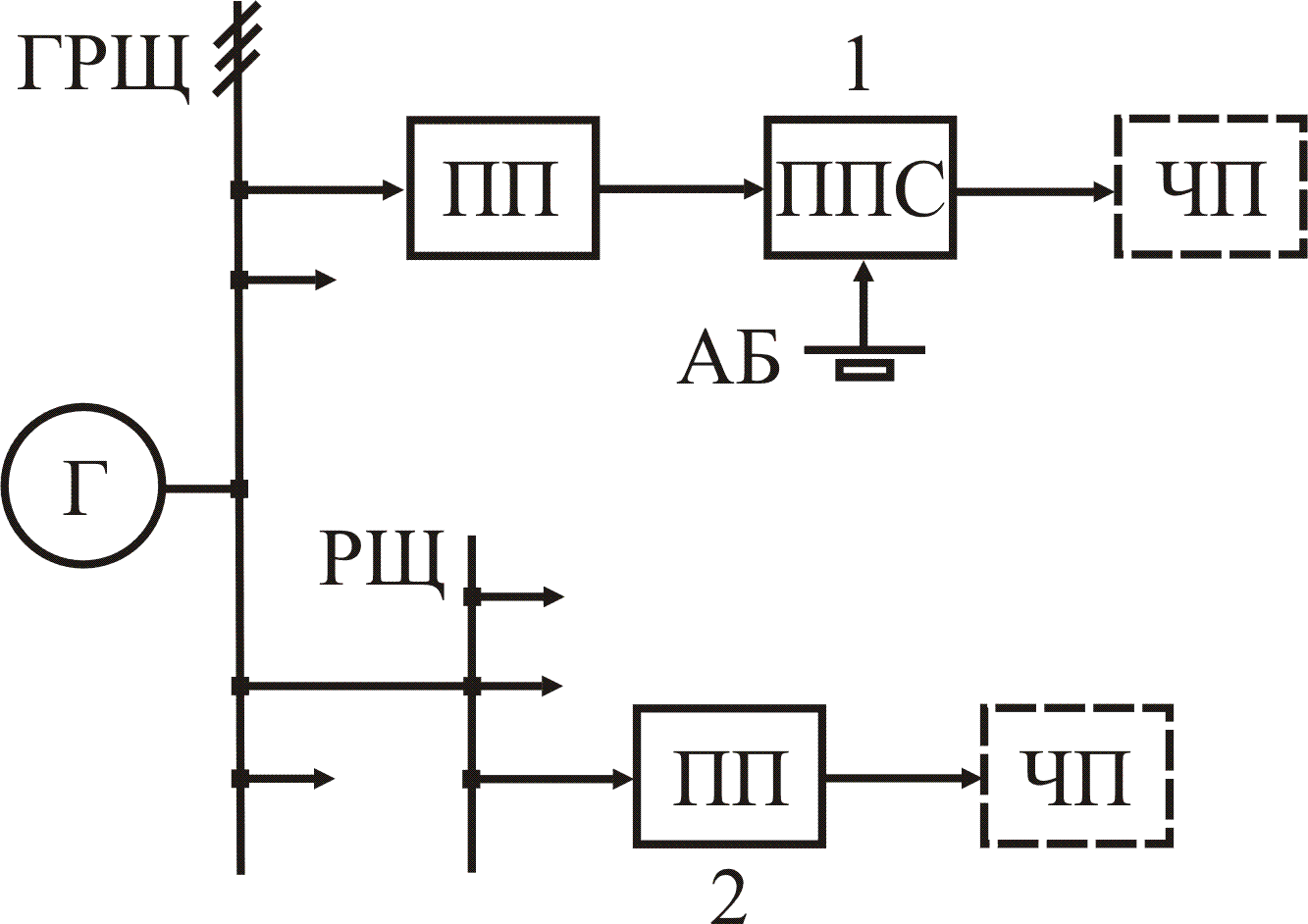 ПП не дает возможности электромагнитного разделения ЧП и судовой сети. Поэтому ПП, питающий ЧП, целесообразно подключать не к относительно маломощным РЩ, откуда также могут питаться источники помех (структура 2 рис.5.20), а непосредственно к ГРЩ (структура 1). Тогда, например, амплитуда коммутационных помех (возникающих при коммутациях потребителей) на его входе будет уменьшена более чем в (N+1)/2 раз, где N – число фидеров, подключенных к ГРЩ. Структура 1 питания ЧП (см. рис.5.20) обладает еще и тем преимуществом, что для обеспечения надежной работы наиболее ответственных ЧП при помехах они могут переводиться на режим питания (с помощью переключателя питающей сети – ППС) от автономной аккумуляторной батареи АБ. Это обеспечивает электромагнитную развязку ЧП и судовой сети.
