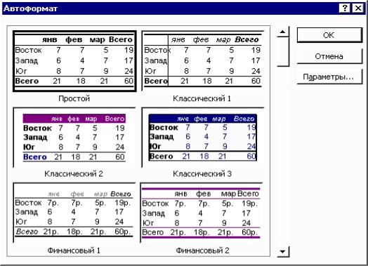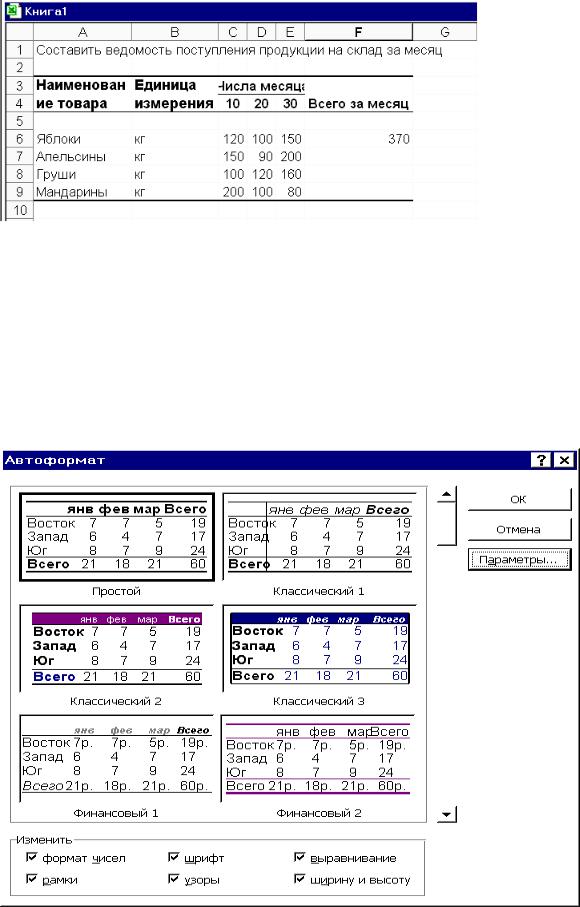 При использовании функции автоформатирования Excel автоматически создает красивую и наглядную таблицу, а пользователь может уделить основное внимание ее содержимому. Для выполнения автоформатирования предназначена команда Автоформат меню Формат (рис. 6.14).