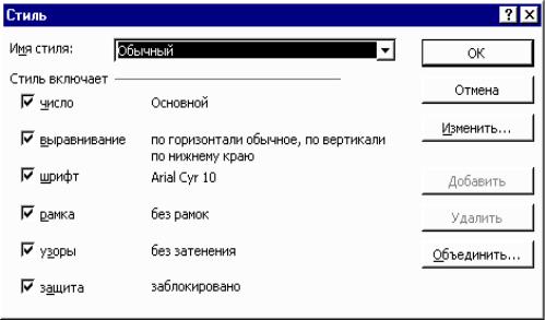 Перед копированием стиля из одной рабочей книги в другую надлежит сначала открыть обе рабочие книги. Затем в окне книги, в которую копируется стиль, следует вызвать команду Стиль и в открывшемся диалоговом окне нажать кнопку Объединить. В результате появится диалоговое окно Объединение стилей, в котором нужно выбрать имя исходной книги и щелкнуть на кнопку ОК. В результате все стили из выбранной рабочей книги будут скопированы в текущую.