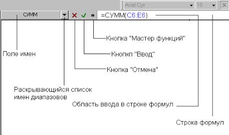 Во время редактирования ячейки, в том числе при создании функции, введенное значение отображается в строке формул. Чтобы закончить ввод, следует нажать клавишу [Enter] или кнопку с изображением галочки, появляющуюся в строке формул. Чтобы отменить ввод, следует нажать клавишу [Esc] или кнопку с изображением крестика. Строка формул содержит поле имен, в котором отображается ссылка на активную ячейку или её имя, и раскрывшийся список имен ячеек и диапазонов. На стандартной панели инструментов находится кнопка Автосуммирование, позволяющая автоматически ввести функции, вычисляющие сумму значений в ячейках диапазона. Кнопка, активизирующая Мастер функций, находится на стандартной панели инструментов и в строке формул.