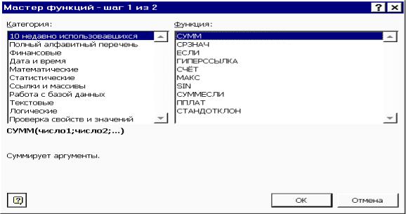ции Мастер функций, выбрать команду Вставка, Функция. Появится диалоговое окно Мастер функций (рис. 8.3).