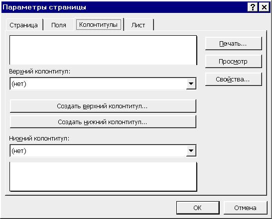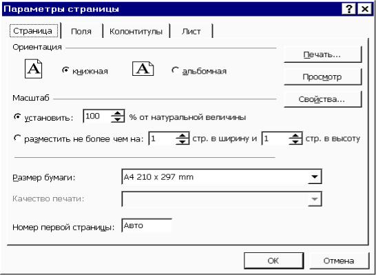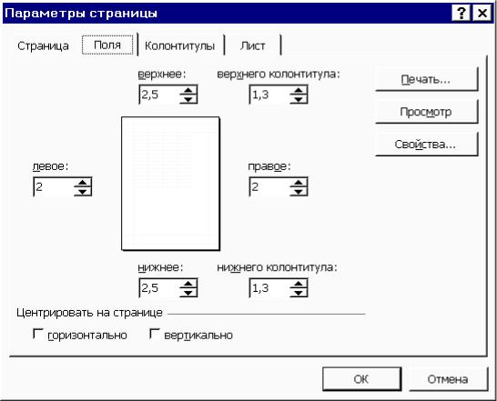 Изменяя параметры, можно придать выводимым на печать страницам желаемый вид, т.е. выбрать формат страницы, задать параметры для полей, верхнего и нижнего колонтитулов, а также специальные параметры для печати таблиц и диаграмм. Эти установки следует сделать в диалоговом окне Параметры страницы, для открытия которого нужно выбрать из ме-