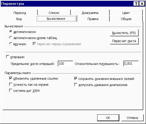 На вкладке Вычисления устанавливаются параметры, определяющие режим выполнения вычислений на рабочем листе.