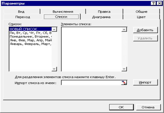 Рис.2.6. Вкладка Списки диалогового окна Параметры