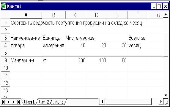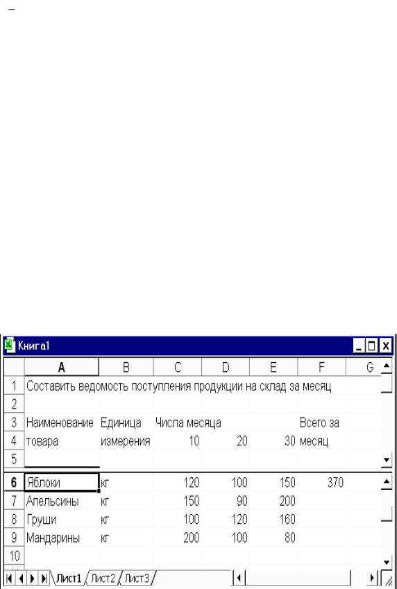 Например: Рабочий лист, на котором находится электронная Табли- ца-пример (рис. 4.1), разделить по горизонтали на две части. Зафиксировать горизонтальную линию разбиения между пятой и шестой строкой. Активизировать команду Разделить из меню Окно.
