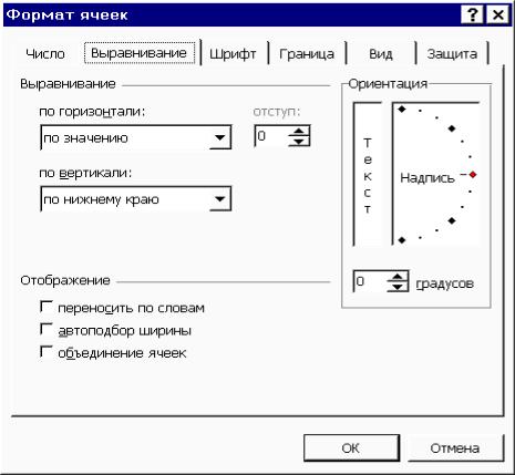Различают выравнивание по горизонтали и по вертикали. По умолчанию в поле по горизонтали установлено значение по значению, а в поле по вертикали – значение по нижнему краю. При выравнивании по верти-