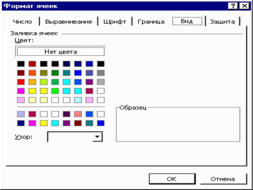 В Exсel предусмотрена возможность цветового оформления переднего плана и фона. Цвет и узор заполнения ячеек устанавливается на вкладке Вид диалогового окна Формат ячеек.