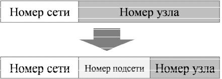 При использовании подсетей на базе классовой адресации поле номера узла разделяется на поля номера подсети и номера узла, таким образом, IP адрес состоит из трех частей (рис. 9):