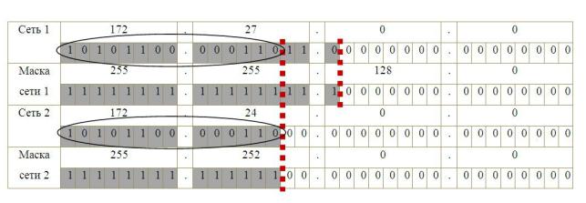 Например, даны блоки IP адресов 172.27.0.0/17 и 172.24.0.0/14. В двоичном виде блоки адресов с масками показаны на рис. 13.