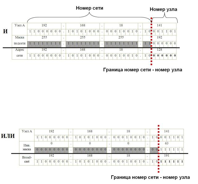 В десятичном виде адрес сети будет иметь значение 192.168.18.128. Найдем broadcast адрес сети узла A, выполнив для этого операцию побитового «ИЛИ» адреса узла А с инвертированной маской подсети (рис. 15).