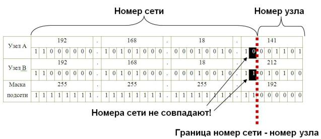 Решение данной задачи рассмотрим на конкретном примере. Пусть узел A имеет IP адрес 192.168.18.141 и маску подсети 255.255.255.192. Определить принадлежность узла B с IP адресом 192.168.18.212 к сети, в состав которой входит узел A.