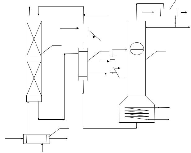1.Без отвода теплоты, то есть как адиабатическая абсорбция. Однако при больших значениях дифференциальной теплоты растворения линия равновесия при адиабатической абсорбции быстро поднимается вверх с увеличением содержания поглощаемого компонента в жидкости. Поэтому при необходимости достигнуть более высоких концентраций компонента в поглотителе приходится прибегать к абсорбции с отводом теплоты. Адиабатическая абсорбция проводится в насадочных и тарельчатых колоннах. Схема абсорбционно - десорбционной установки приведена на рисунке 1.