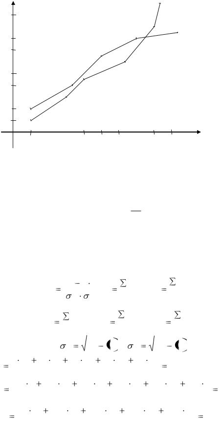 В прямоугольной системе координат построим точки Аi(хi,YXi ), соединим их отрезками, получим эмпирическую линию регрессии Y на X. Аналогично строятся точки В j( X Y j ,yj) и эмпирическая линия регрессии X