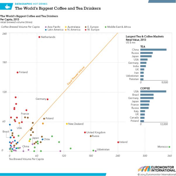 которые пьют много кофе мало вероятно, что пьют много чая и наоборот, в то время как для большинства рынков в Западной Европе, например, наблюда-