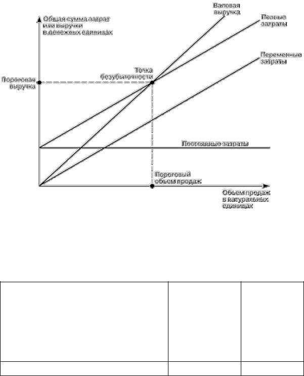Тема включает основы маржинального анализа. В основу методики маржинального анализа положено деление всех затрат (издержек, расходов, себестоимости) на постоянные и переменные. Анализ связи между затратами, объёмом продаж и прибылью составляет существо маржинального анализа. Возможности маржинального анализа позволяют планировать уровень, расходов, продаж или прибыли при заданном уровне других показателей. Одно из направлений – расчёт точки безубыточности. Её можно определить различными способами. Расчётным путём для однопродуктового или многопродуктового предприятия будет рассмотрен ниже в заданиях, а сейчас приведём пример графического расчёта безубыточности на рисунке 18: