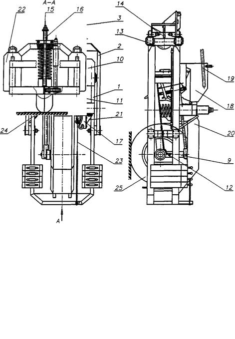 ПКРС состоит из колеса 25 (рис. 2), установленного на подрессоренной оси – подвески 4. Ось – подвеска позволяет колесу совершать вертикальные колебания относительно рамы 1. Рама с помощью двух вилок 2, образующих параллелограмм в вертикальной плоскости, крепится к траверсе сцепки 7, которая соединяется с кронштейном сцепки 3. Благодаря параллелограммной сцепке рама устройства постоянно сохраняет положение, параллельное поверхности