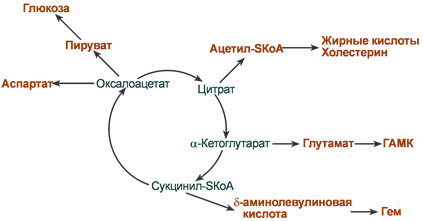 Промежуточные продукты цикла: α-кетоглутарат, сукцинат, оксалоацетат