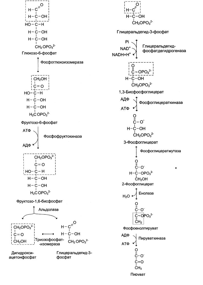 фосфотриозы превращаются в пируват. Энергия, высвобождающаяся на этом этапе, используется для синтеза 10 моль АТФ.