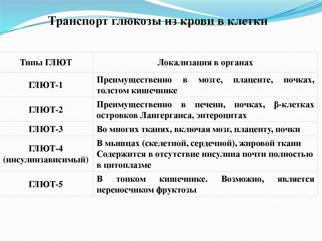 несколько их разновидностей. Структура белков семейства ГЛЮТ отличается от белков, транспортирующих глюкозу через мембрану в кишечнике и почках против градиента концентрации.
