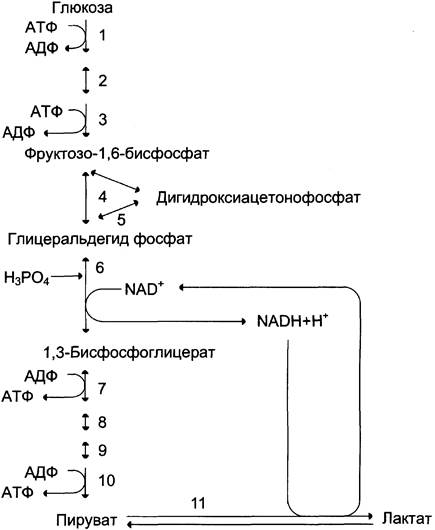 аэробному гликолизу. Лишь 11-я реакция, где происходит восстановление пирувата цитозольным NADH, является специфической для анаэробного гликолизаю