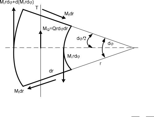 Согласно рис. 3, а в окружных сечениях действуют поперечная сила Q r d и момент Mr r d . В радиальных сечениях тангенциальные силы (в виду симметрии) отсутствуют и момент равен