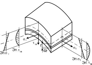Кроме нормальных напряжений возникают касательные напряжения rz перпендикулярные срединной поверхности. Напряжения распределены по параболическому закону (см. поперечный изгиб прямых стержней [1]). Роль касательных напряжений невелика ввиду незначительной толщины пластины h по отношению к диаметру и много меньше нормальных. Однако равнодействующей касательных напряжений – поперечной силой Q rz r d h пренебрегать нельзя, ибо она играет важную роль в уравнениях равновесия элемента пластины (см. рис. 3, а).