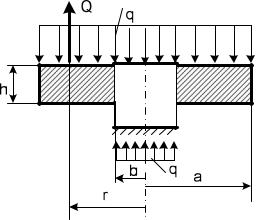 Определим действие погонной силы Q 2 r в произвольном сечении пластины радиуса r (см. рис.8). С учетом неподвижности центрального стержня диаметром 2b усилия от внешнего воздействия равны: Q 2 r q a2 b2 q b2. Последнее слагаемое
