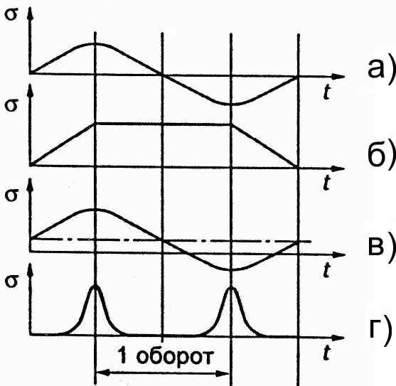 5.15 Какой из приведённых ниже циклов напряжений характеризует изменение контактных напряжений на поверхности зубьев?