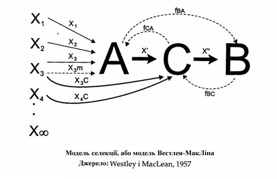 Модель селекції, або модель Вестлі і МакЛіна. Вестлі й МакЛін (1957) на своїй моделі комунікації, що належить до трансмісійного виду моделей, додали істотну характеристику, відсутню, скажімо, на моделі Шеннона – це наявність професіонального комунікатора (медійної інституції) (С), який опосередковує процес спілкування.