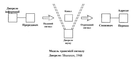 Модель трансмісії сигналу, або модель Шеннона-Вівера. Запропонована математиком К.Шенноном (1948) модель передачі сигналу для технічних систем з допомогою В.Вівера набула такого вигляду: