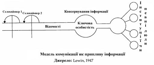 Модель Левіна, або топологічна модель (модель комунікації як припливу інформації). Соціальний психолог Курт Левін (1947) застосував до процесу комунікації поняття припливу повідомлень. Левін виходив з того, що в різних соціальних ситуаціях приплив інформації є завжди нерівномірним та неповним. Приплив інформації регулюється бар’єрами (Левін називав їх воротами). У ролі таких бар’єрів виступають певні інституції чи окремі люди (jednostki), які одну інформацію затримують, іншу пропускають. У масовій комунікації такими особами є редактори, видавці, засновники тощо.