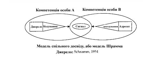 Модель спільного досвіду, або модель Шрамма. Вільбур Шрамм, перший із гуманітаріїв, хто адаптував технічну модель Шеннона до нетехнічних умов спілкування (1954). Він першим застосував термін спільного досвіду (shared experience) до процесу комунікації, тобто спільних позицій, ідей, символів, які об’єднують комуніканта й комуніката.