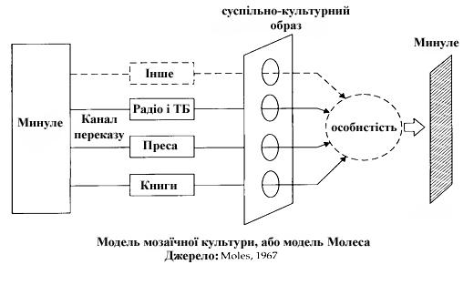 Абрагама Молес створив модель (1967), в основу якої поклав тезу, що сучасна культура є цілістю неупорядкованою, має мозаїчну структуру з елементами різної вартості. Така культура є продуктом функціонування ЗМК. Ця культура випливає з надбань минулого, колись сучасного, а сукупність її висловлювань творить суспільно-культурний образ, який формує сучасний споживач інформації. Комунікативний процес на моделі Молеса є багаторівневим, розшарованим.