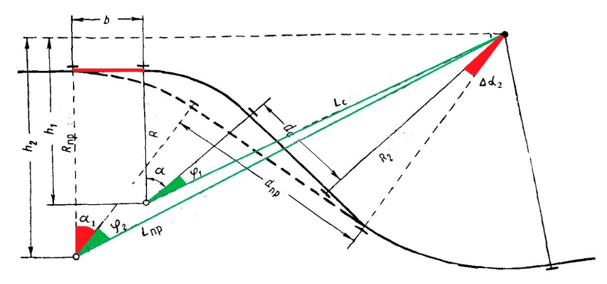 2. Для нахождения длины участка реконструкции Lрек и величины сокращения длины линии ΔL необходимо определить следующие параметры: b - расстояние от начала проектируемой кривой до начала существующей кривой, а также углы α1, Δα2 (показаны красным цветом на рисунке 3).