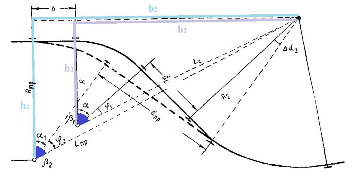 Для определения параметров b, α1, Δα2 вычислим углы β1 и β2 (на рисунке 4 углы показаны синим цветом):
