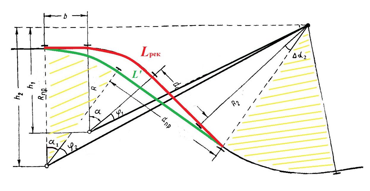 Lрек=b+K1(с)+ dс+∆K = 246,09 +989,60 + 80 + 197,48= 1513,17 м (16)
