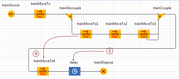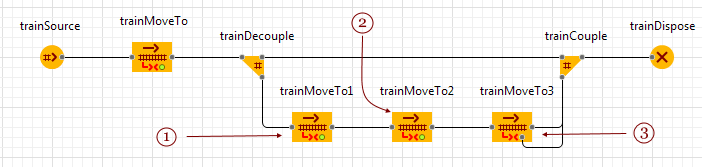 Обратите внимание на количество соединений, ведущих от блока trainMoveTo3 к блоку trainCouple. Нижний порт блока TrainMoveTo, в отличие от порта out, который находится справа, используется поездами, которые сталкиваются с другими поездами. В нашем случае, сталкивание является сцеплением локомотива, прибывающего к точке ж/д пути stopLineArrival, с вагонами, которые мы предварительно отцепили от этого локомотива.