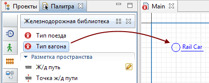 Создайте новый Тип вагона, перетащив элемент Тип вагона из палитры Железнодорожная библиотека на графическую диаграмму Main.
