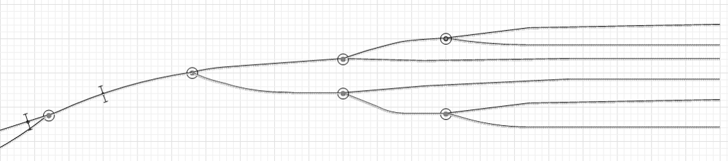 Нарисуйте дополнительно несколько ж/д путей, как показано на рисунке ниже. На этих путях будет происходить накопление вагонов, на каждом пути будут собираться вагоны определенного типа. Чтобы нарисовать подобную топологию ж/д путей, необходимо вначале нарисовать несколько длинных путей, ведущих до самого конца сортировочного парка, и уже затем от некоторых из них рисовать ответвления.
