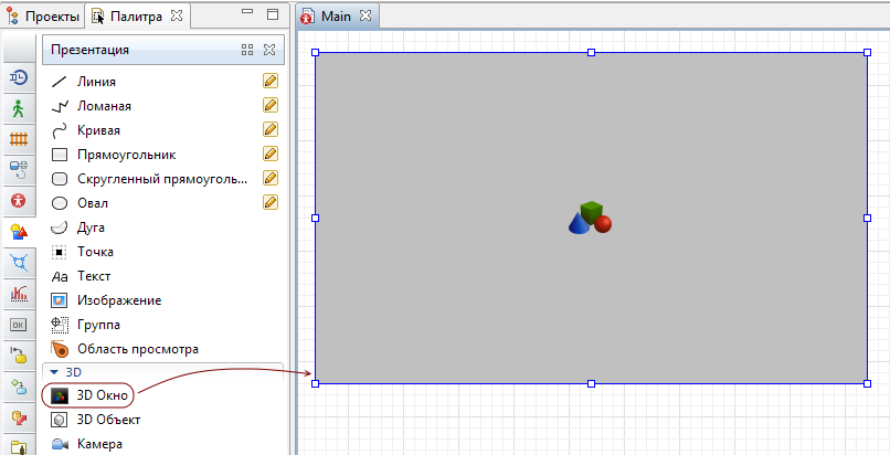 Добавьте 3D окно из палитры Презентация и поместите его под диаграммой процесса и анимацией.