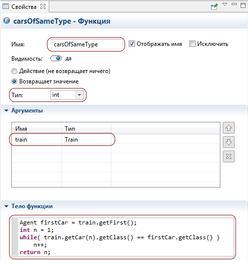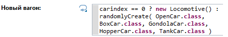 Здесь мы используем условный оператор Java для того, чтобы создавать вагоны различных типов. Когда блок TrainSource создает новый поезд, он последовательно вызывает выражение, заданное в поле Новый вагон, для каждого создаваемого вагона поезда. Локальная переменная carindex хранит индекс только что созданного вагона. Наше выражение проверяет выполнение условия carindex==0. Если индекс равен нулю (то есть, мы имеем дело с первым вагоном состава), то будет выполнено выражение, написанное после знака ?