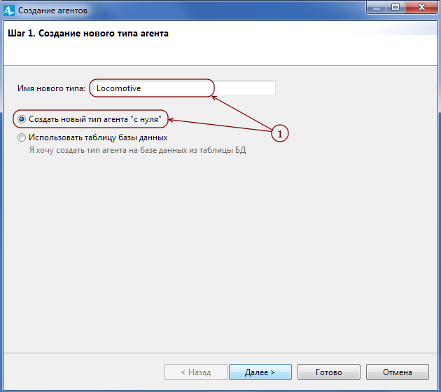 Откроется окно Мастера Создание агентов. Укажите Имя нового типа как Locomotive, оставьте опцию Создать новый тип агента "с нуля" выбранной. Нажмите Далее.
